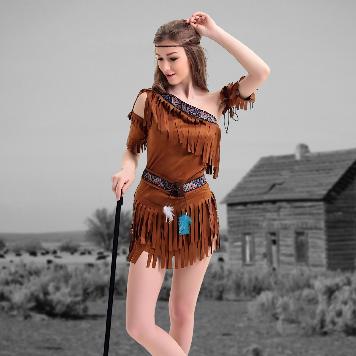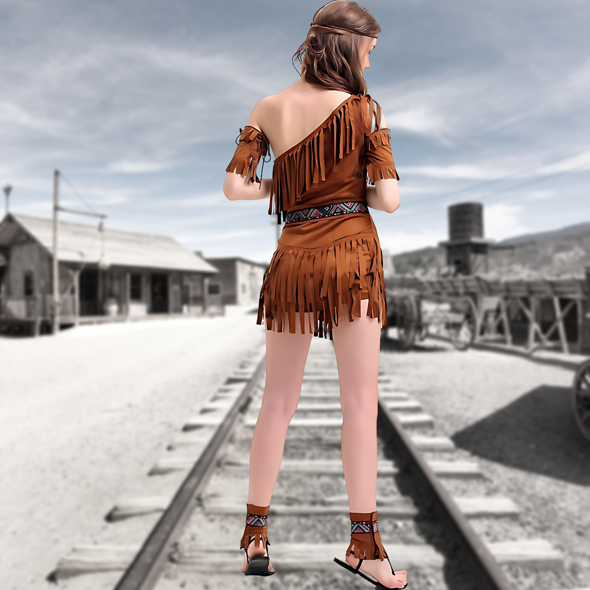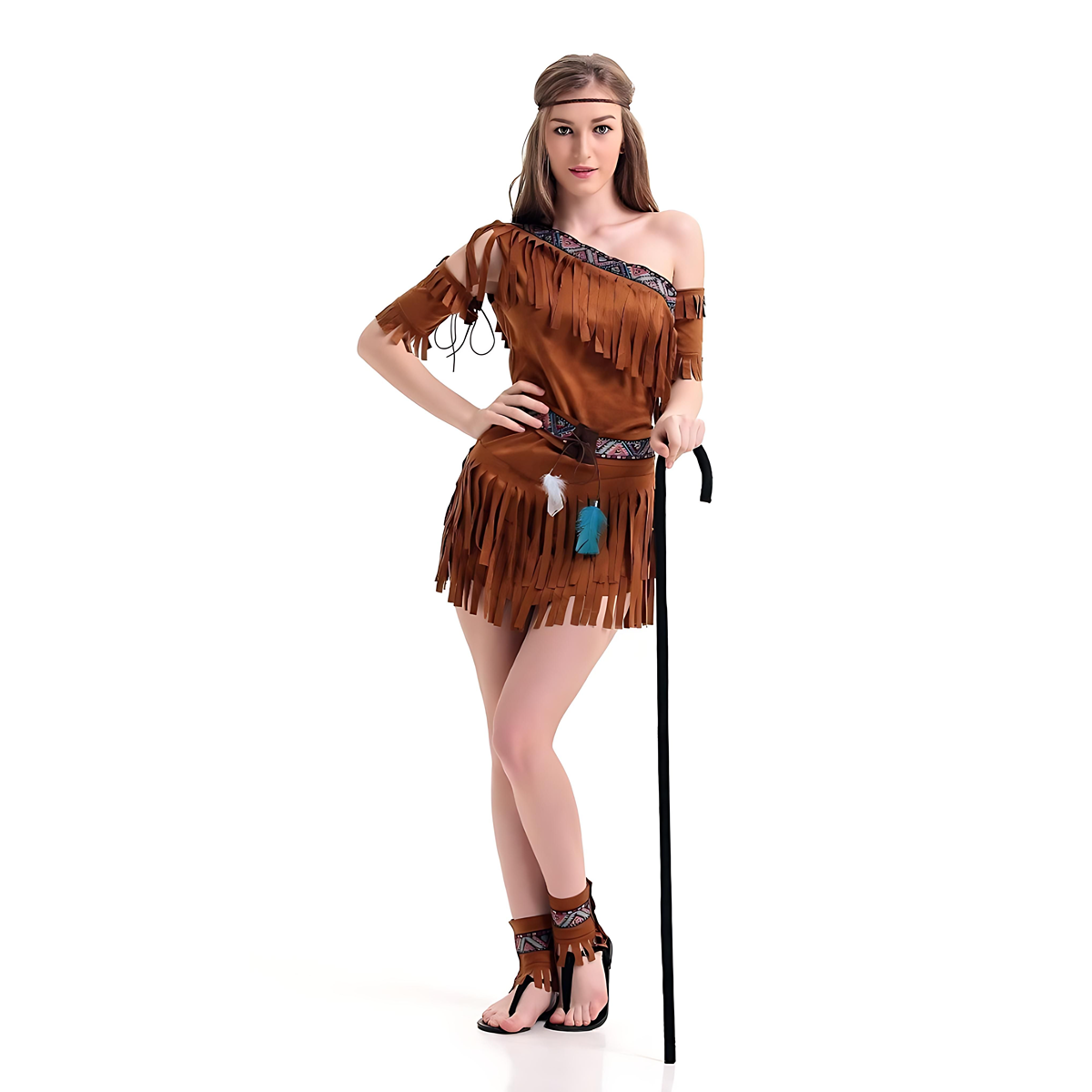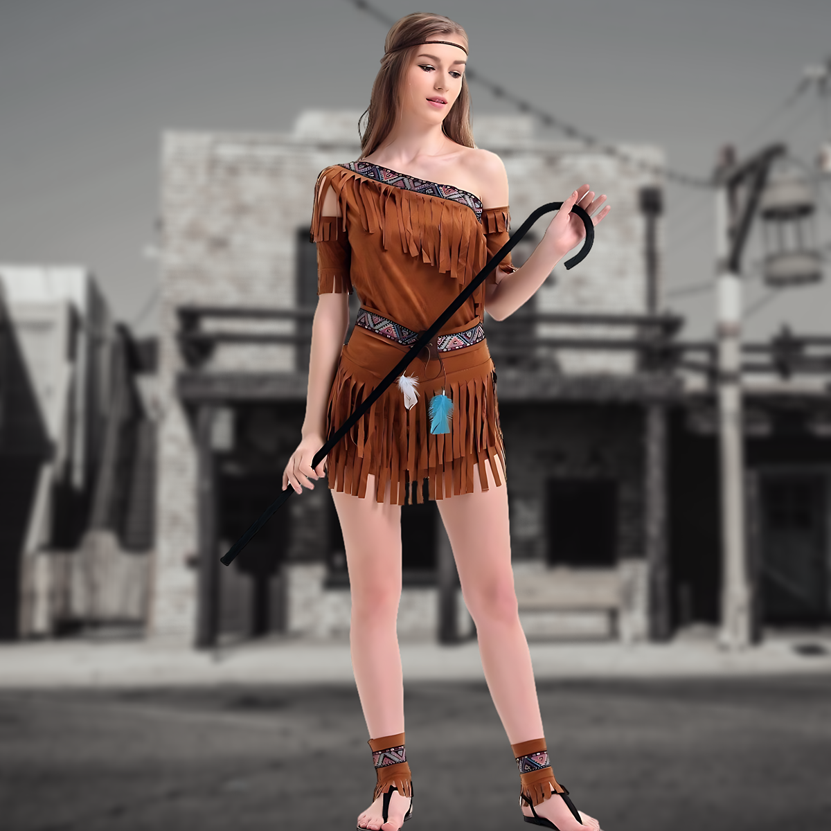 Includes a patterned belt, matching headwear, and decorative feathers for a complete, adventurous ensemble.