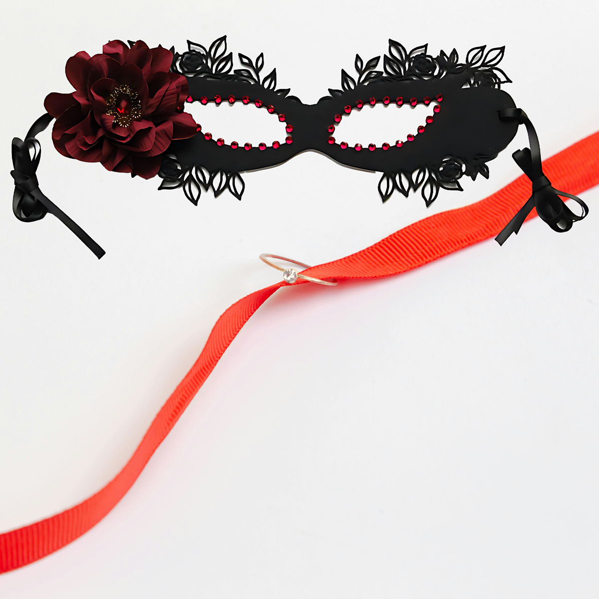 The black lace silhouette and ruby accents catch the light beautifully, creating a look that’s both mysterious and unforgettable.