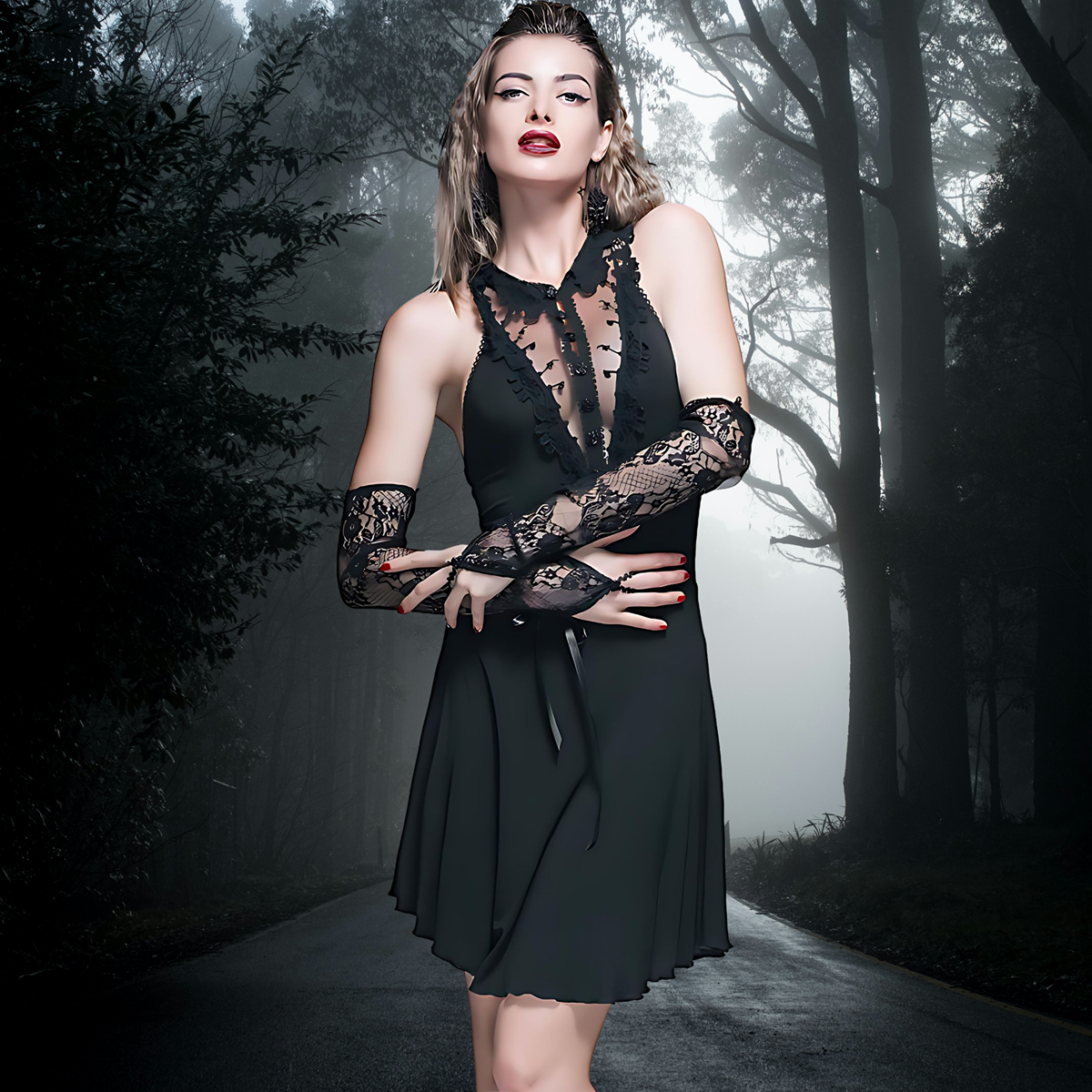 Exquisite gothic lace frames the neckline and arms for a sultry reveal. Designed to balance mystery with sophistication. Crafted from a high-quality cotton-spandex blend, this dress maintains its shape, stretch, and softness even after hours of wear.