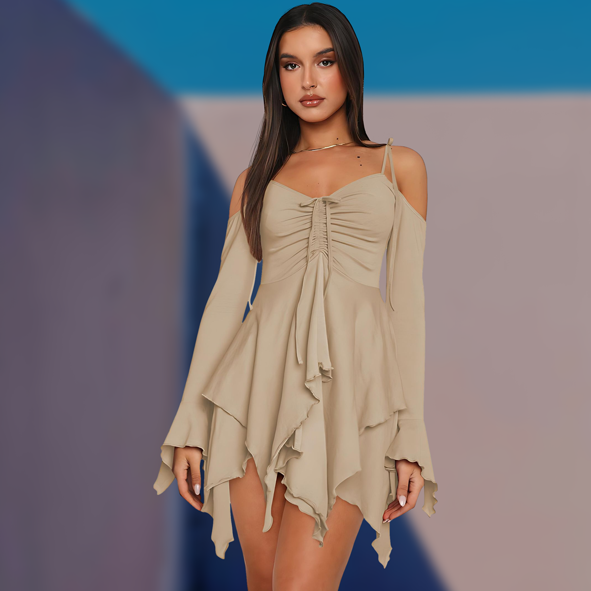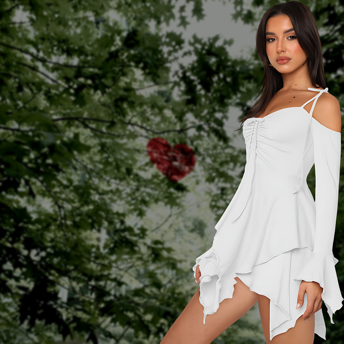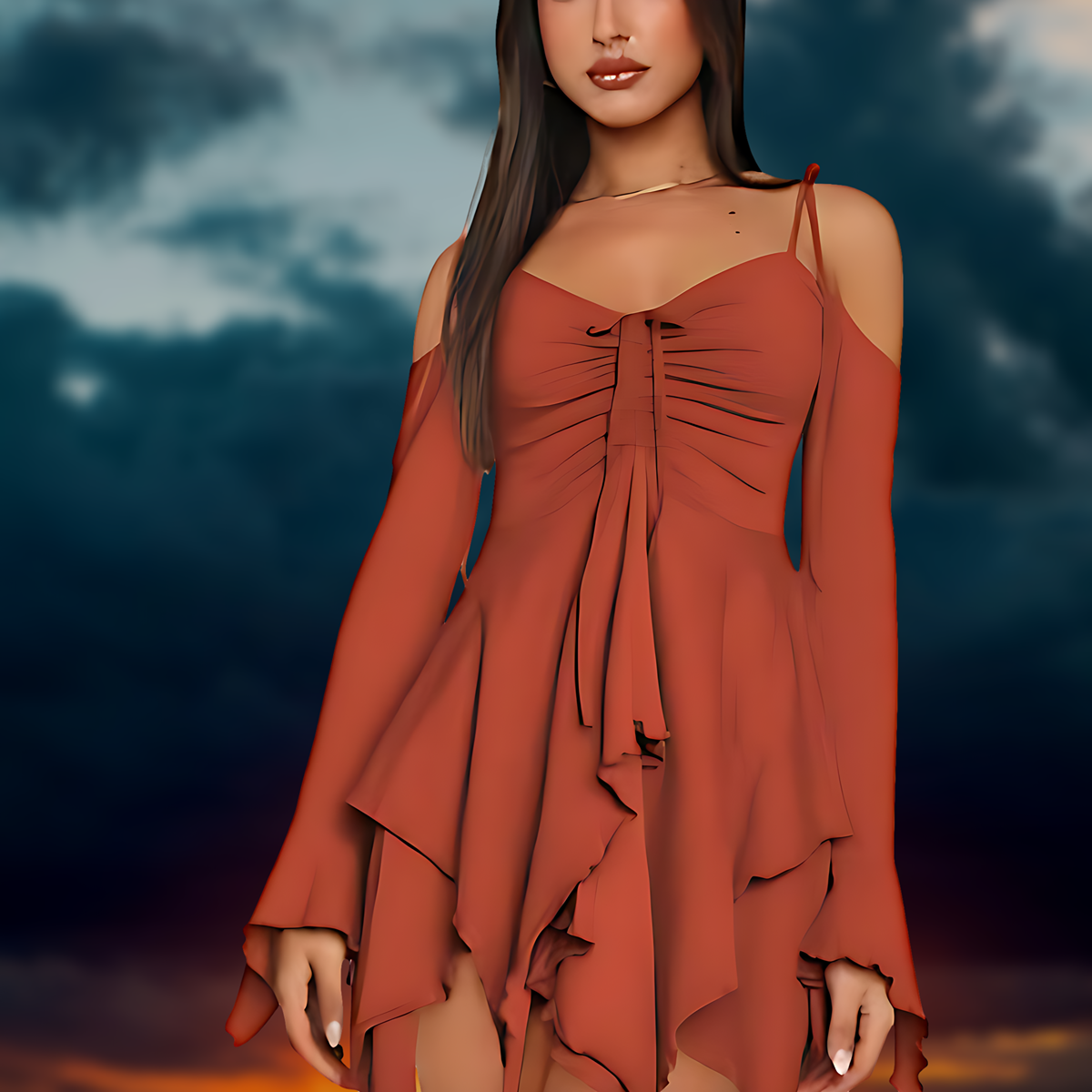 Uneven ruffled edges catch the light as you move, creating hypnotic motion and drama. Every twirl reveals a different angle of allure — the definition of effortless elegance.