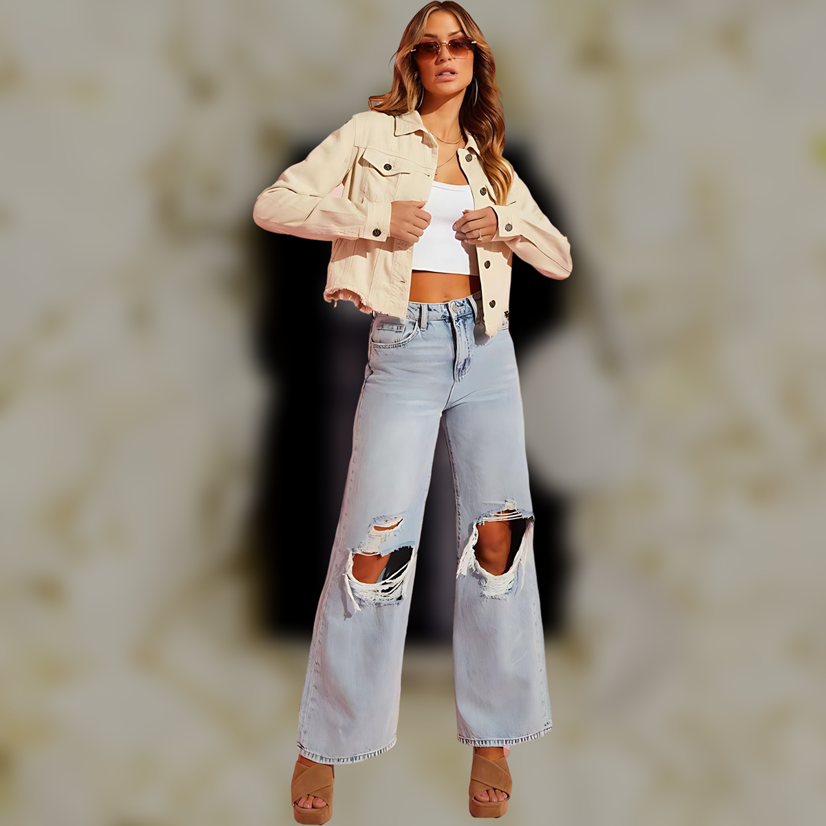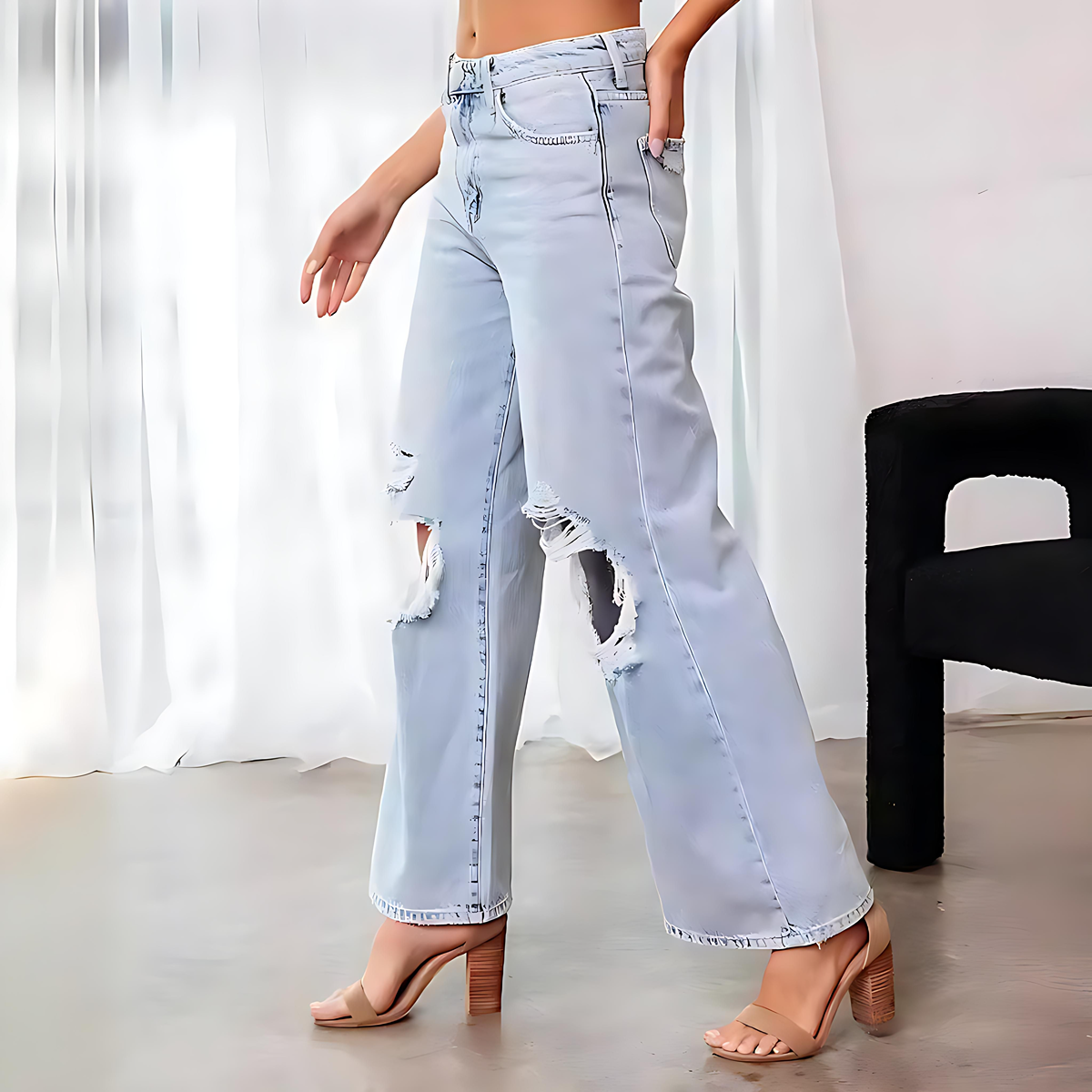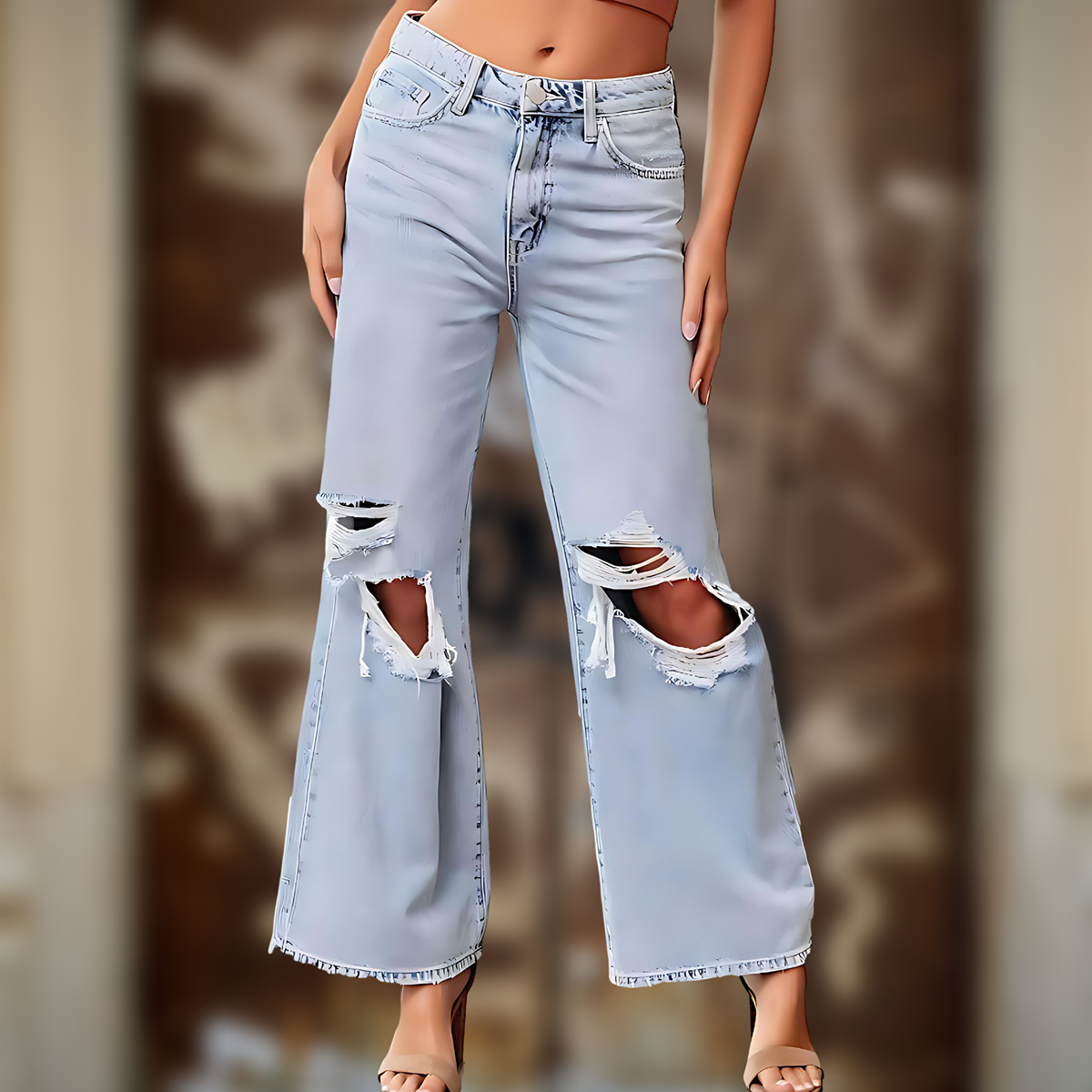 The relaxed wide-leg and distressed knees bring the balance between effortless cool and everyday chic.