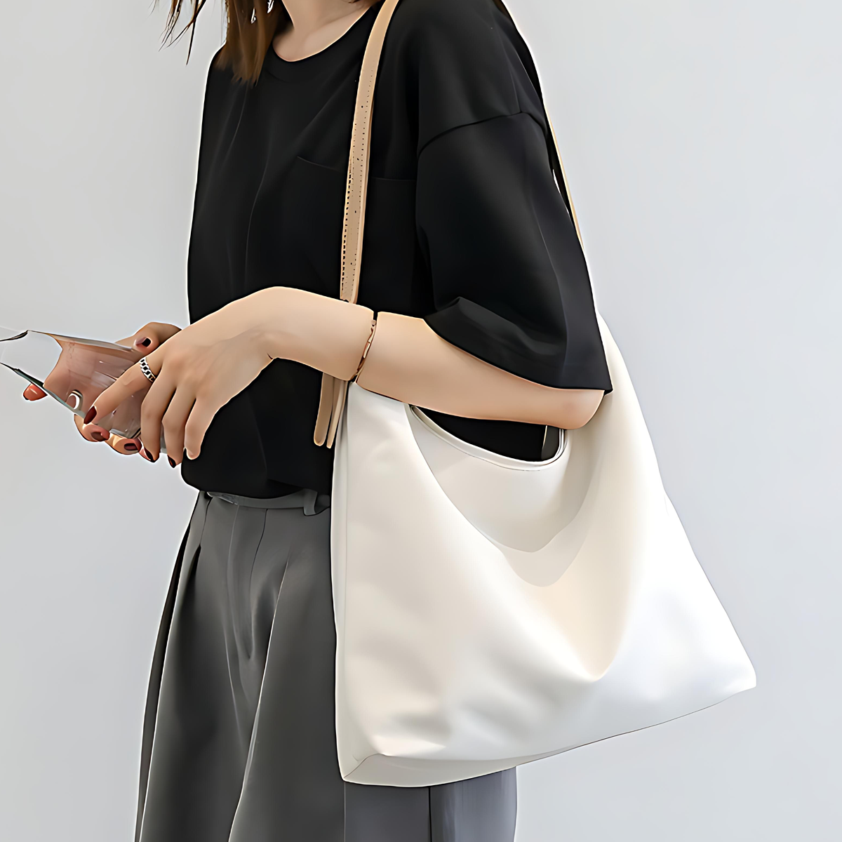 Minimal lines, soft structure, and leather-trim detail make this tote an effortless match for office looks and off-duty fits.