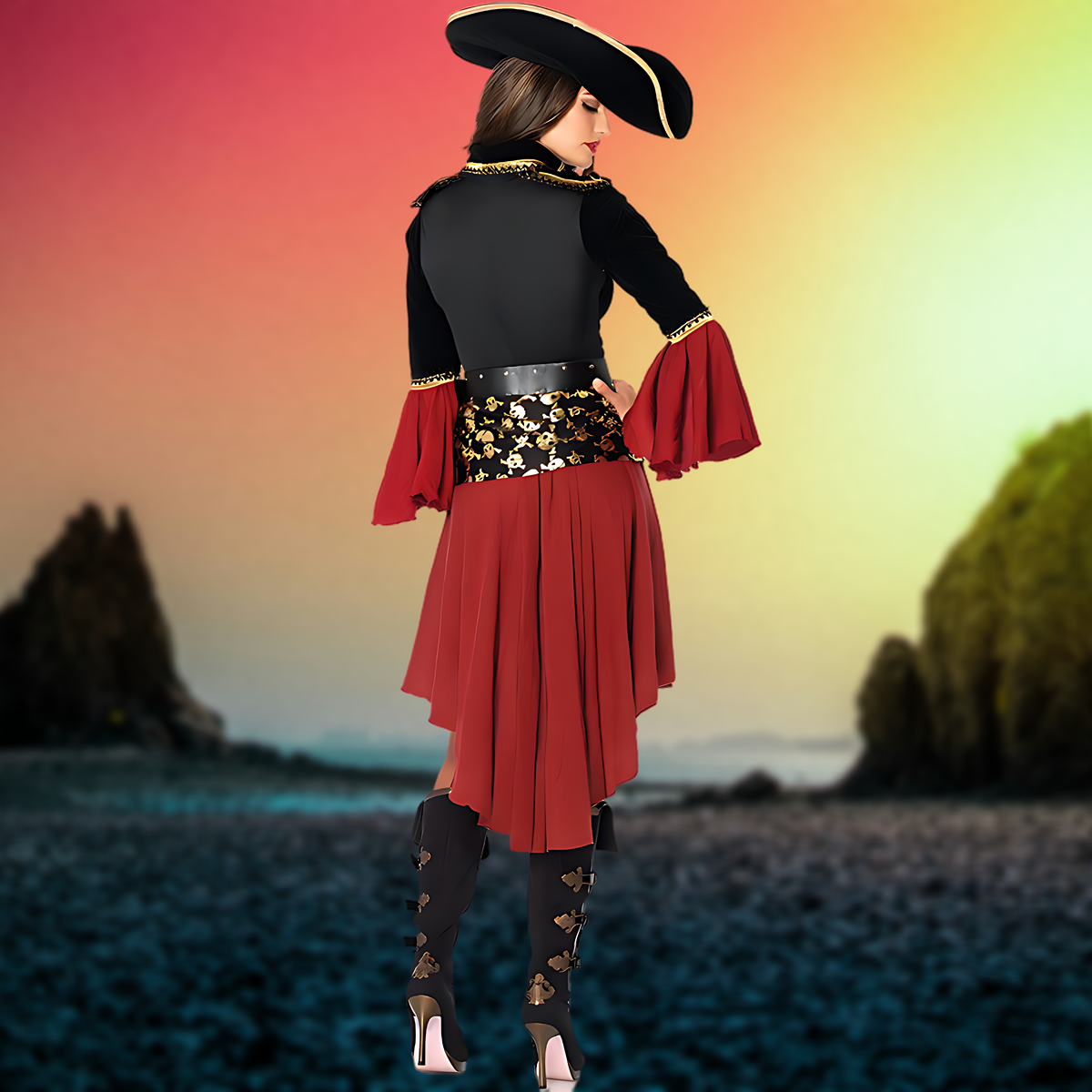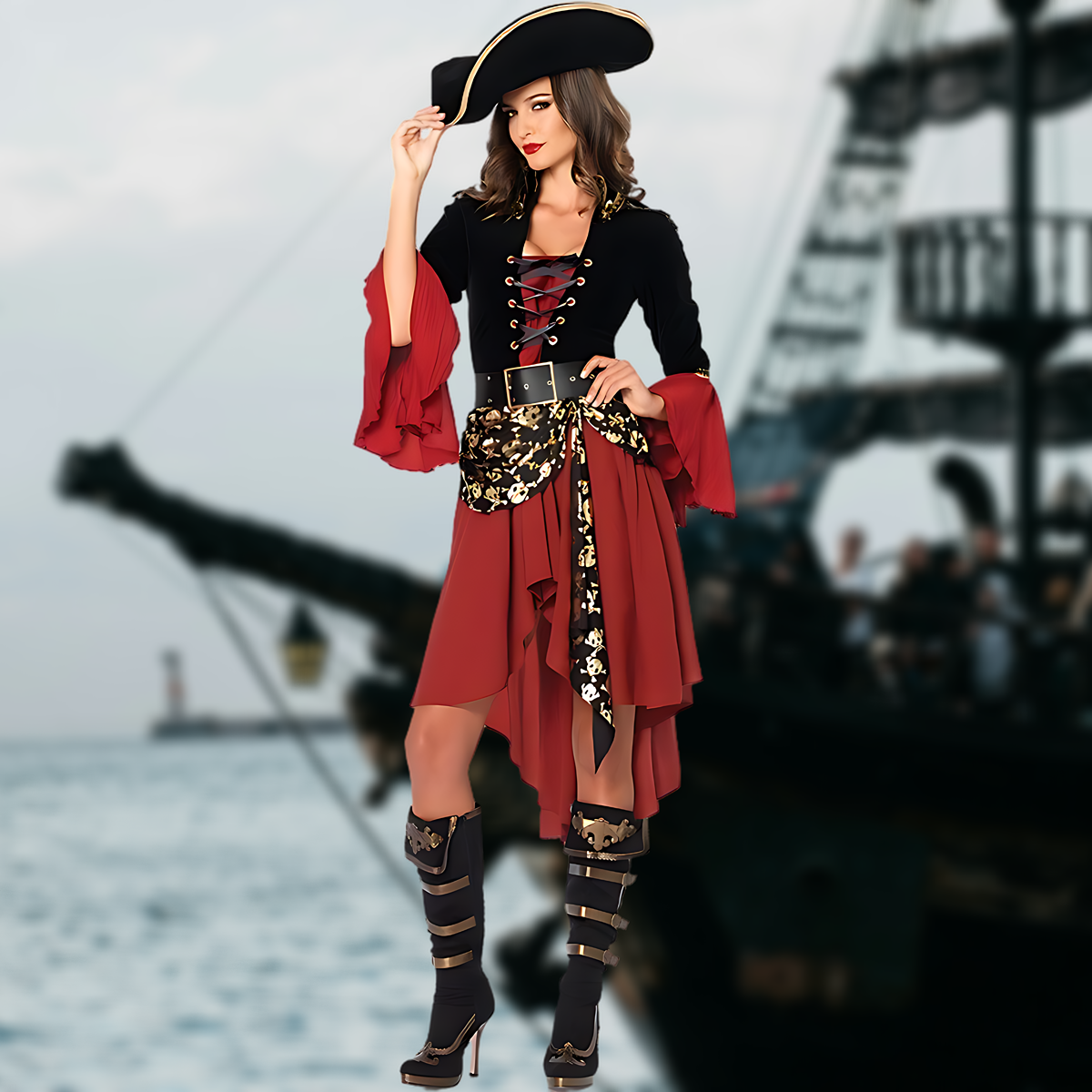 This bold red pirate costume turns you into the fiercest captain on the seas. With structured tailoring and golden accents, it balances fierce energy with feminine confidence.