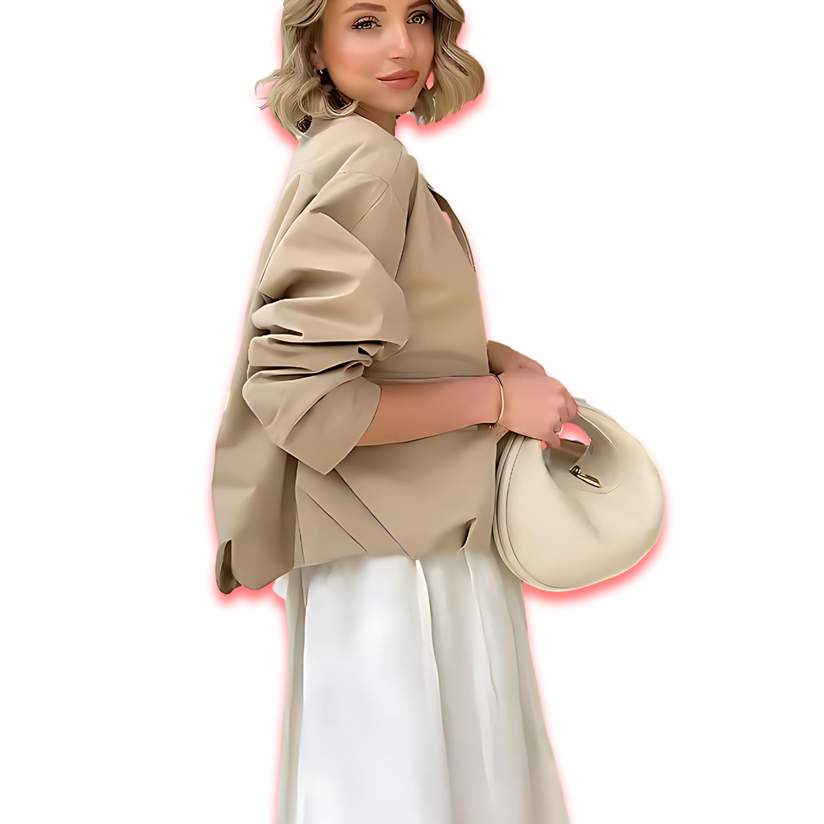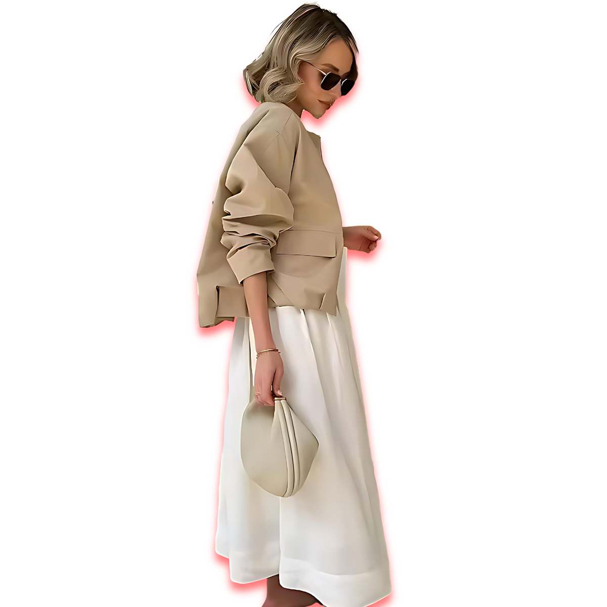 A slightly cropped length gives balance to both high-waisted pants and relaxed skirts. It’s tailored but never tight, allowing freedom and ease in every movement.